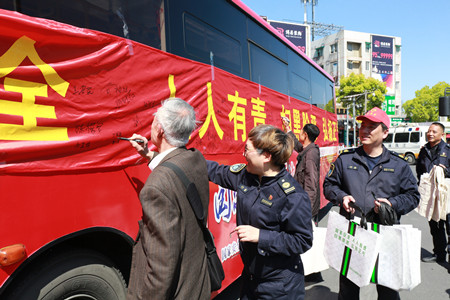 活動期間,公交志愿者們身穿紅馬甲、頭戴小紅帽,團結協作,分工配合,現場秩序一片井然。有的在火車站廣場上發放掃黑除惡專項斗爭宣傳資料和印有活動主題的環保袋,有的走進公交車廂開展義務宣傳,還有的負責引導市民在橫幅上簽名,表達自己對活動的支持。宣傳過程中,志愿者們耐心地向市民宣傳掃黑除惡專項斗爭、平安創建工作、國家安全、治安安全等相關知識,希望通過此次宣傳鼓勵公眾積極參與舉報,共同維護社會治安穩定。整個宣傳活動持續了兩個多小時,市民參與度很高,既有年輕的學生族、上班族,也有許多外來乘客和老年乘客,他們紛紛在橫幅上簽下了自己的名字,并表示將以實際行動參與到國家安全教育宣傳和掃黑除惡專項斗爭中來。