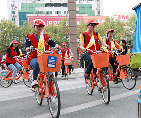4月14日,南湖區(qū)文明辦在八佰伴廣場組織開展“七大文明行動”系列活動。公共自行車公司積極參與,調(diào)運了50輛公共自行車助力“七大文明行動”系列活動啟動,50位身穿紅色馬甲的文明志愿者騎著插有“迎接G20 人人講文明”的小旗子的公共自行車騎行在禾城街頭,倡導文明出行,提升廣大市民的文明素質(zhì),提高社會文明程度。