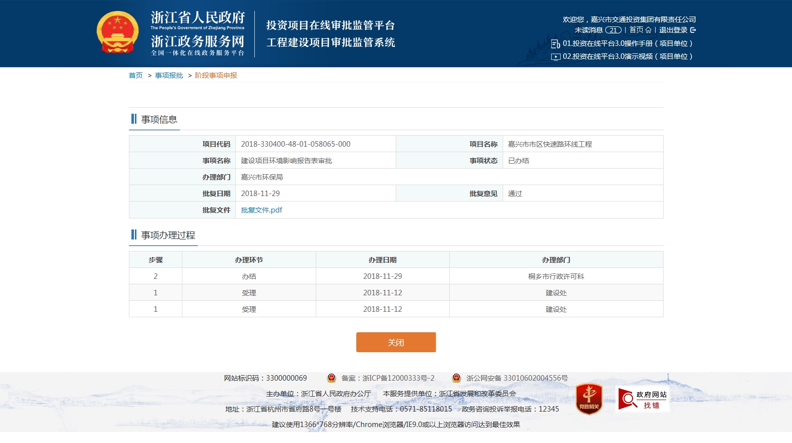 嘉興市市區快速路環線工程一期建設項目環境影響報告表審批